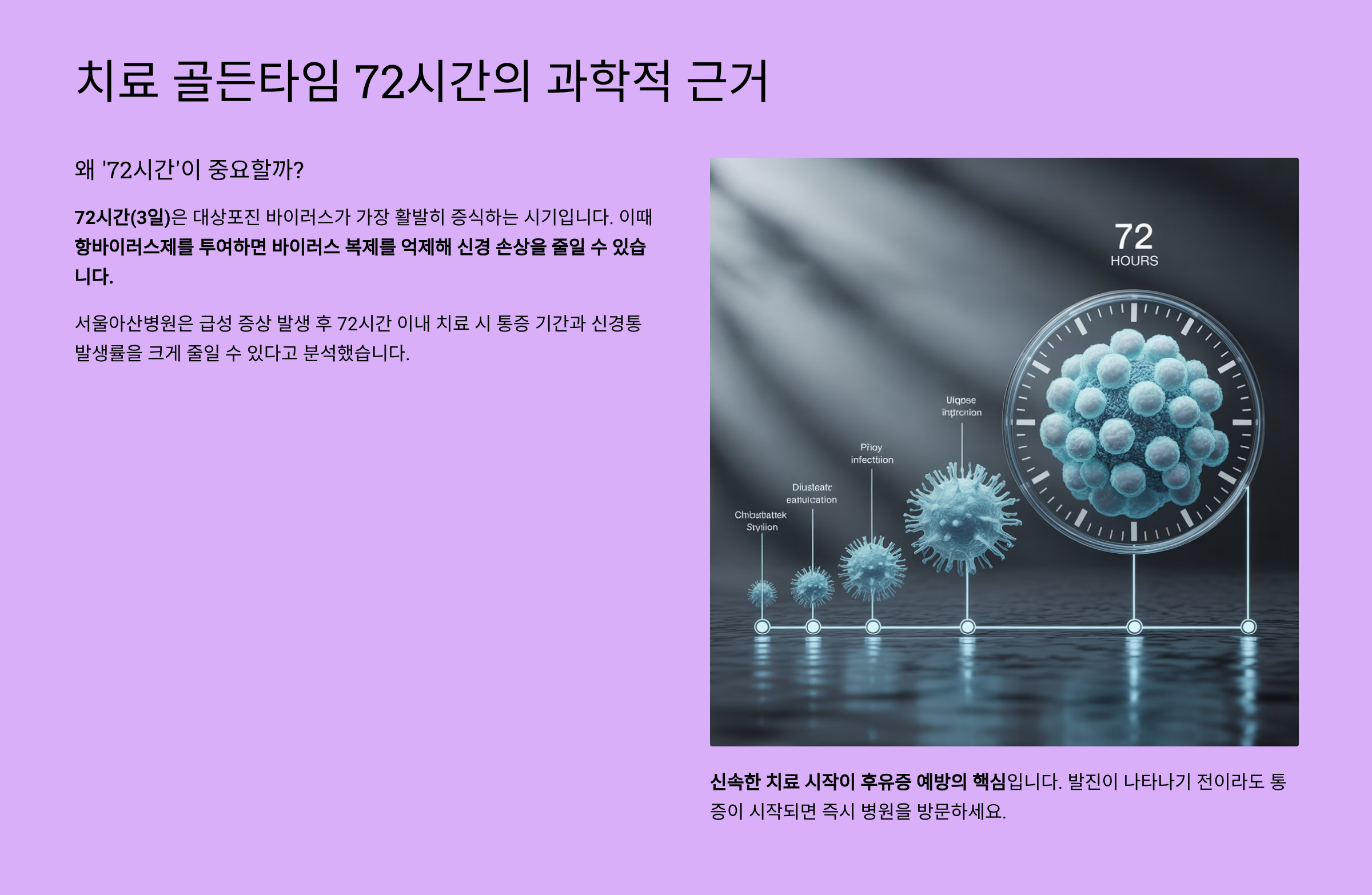 **72시간(3일)**은 대상포진 바이러스가 가장 활발히 증식하는 시기입니다. 이때 **항바이러스제를 투여하면 바이러스 복제를 억제해 신경 손상을 줄일 수 있습니다.**