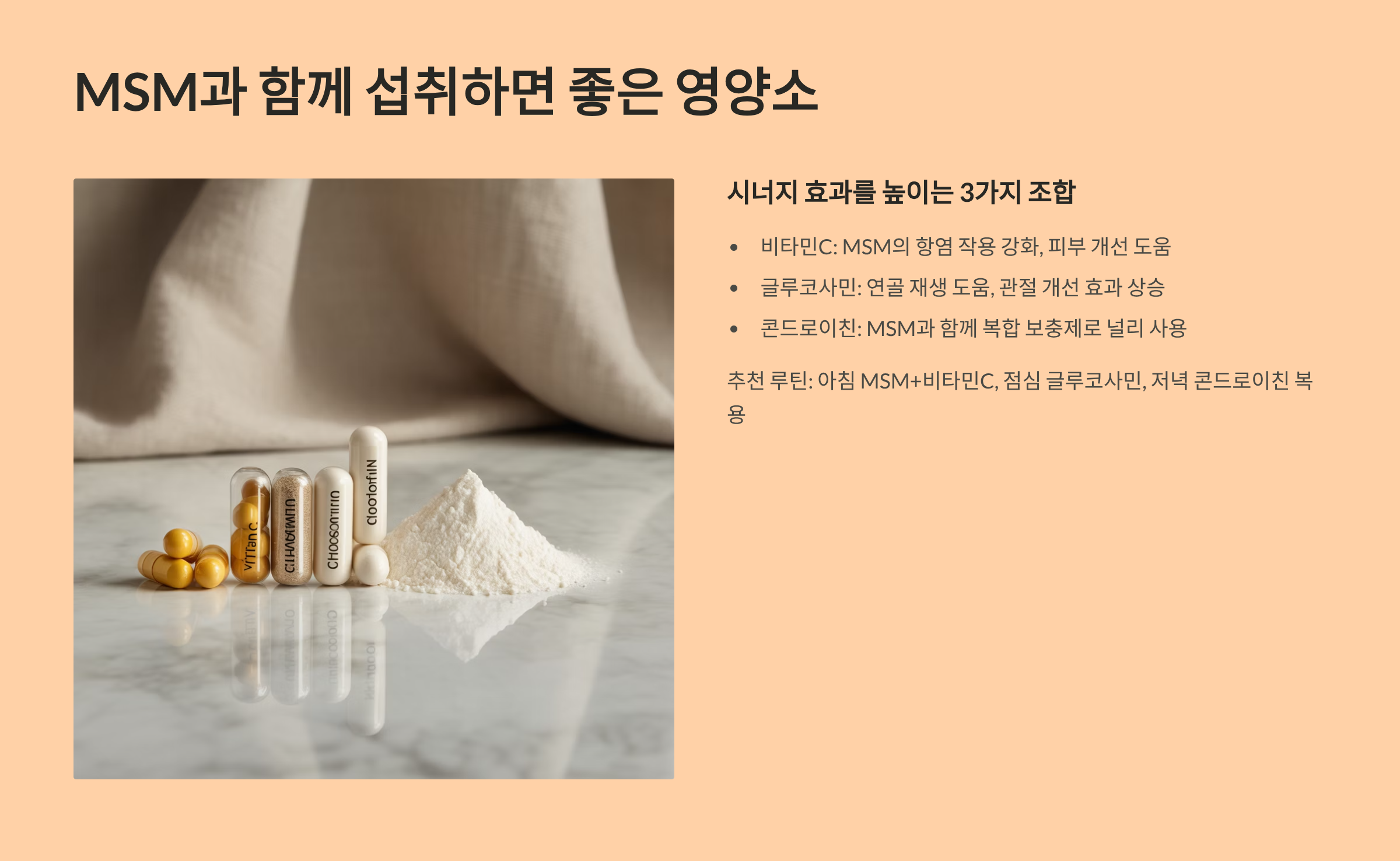 - 비타민C: MSM의 항염 작용을 강화하고 피부 개선에도 도움.