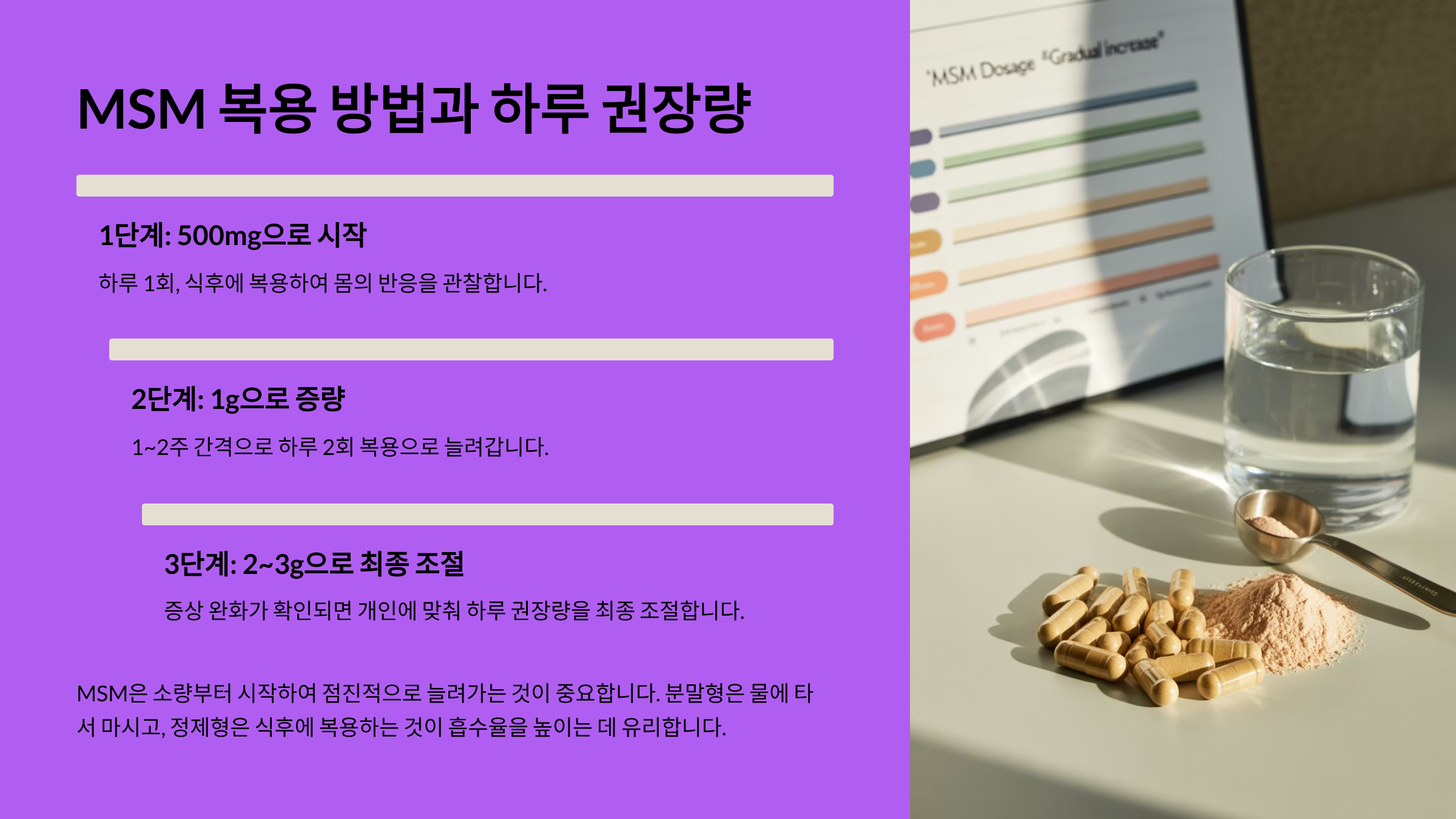 MSM의 일반적인 하루 권장량은 2~3g입니다. 그러나 초기 복용자는 500mg에서 시작해 1~2주 간격으로 천천히 증량하는 것이 좋습니다. 이는 위장 불편, 설사 등 부작용을 예방하기 위함입니다.