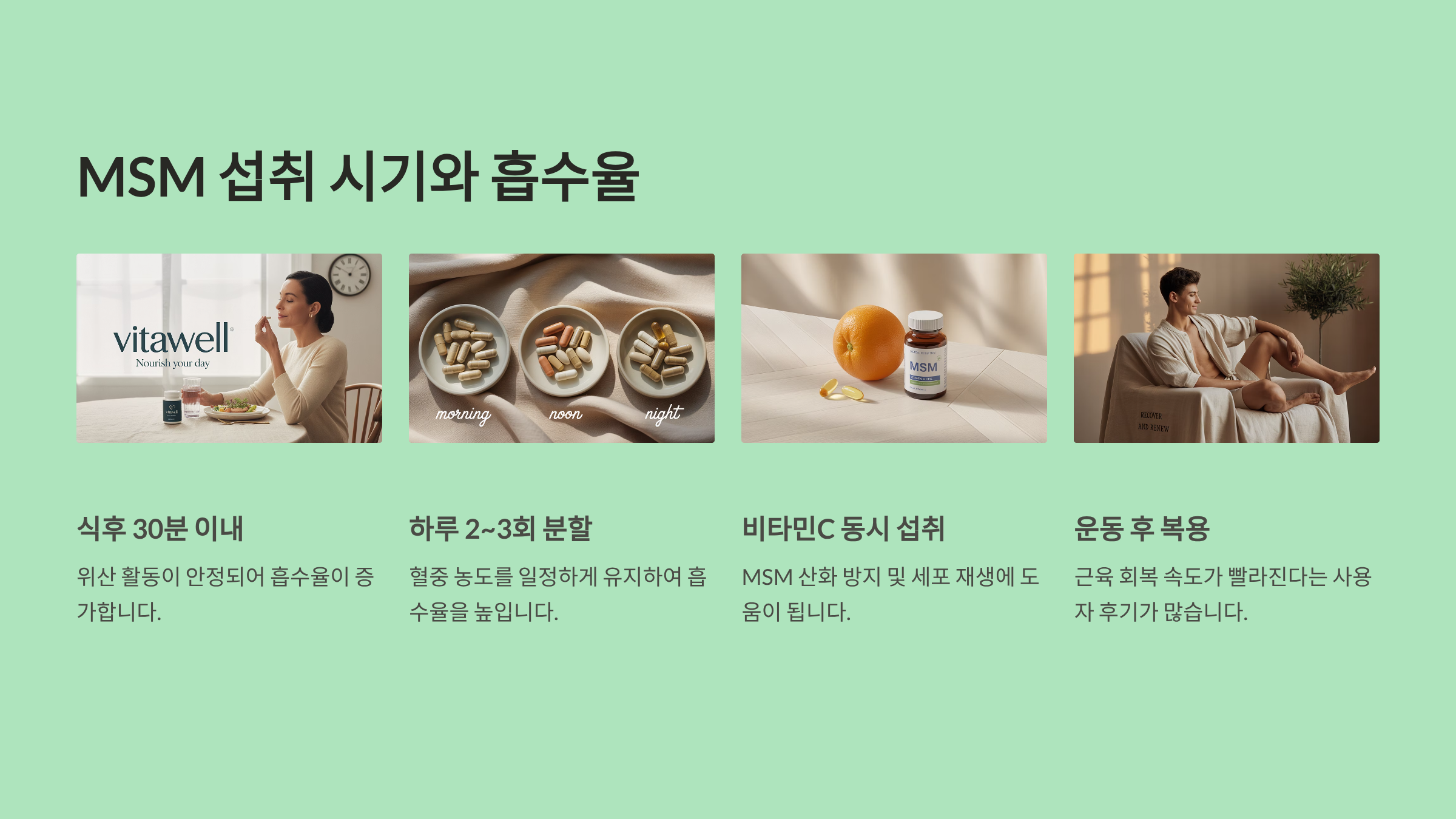 아침과 저녁에 나누어 섭취하면 장시간 통증 완화 효과를 유지할 수 있습니다. 특히 **운동 후 MSM 복용** 시 근육 회복 속도가 빨라졌다는 사용자 후기**도 많습니다.