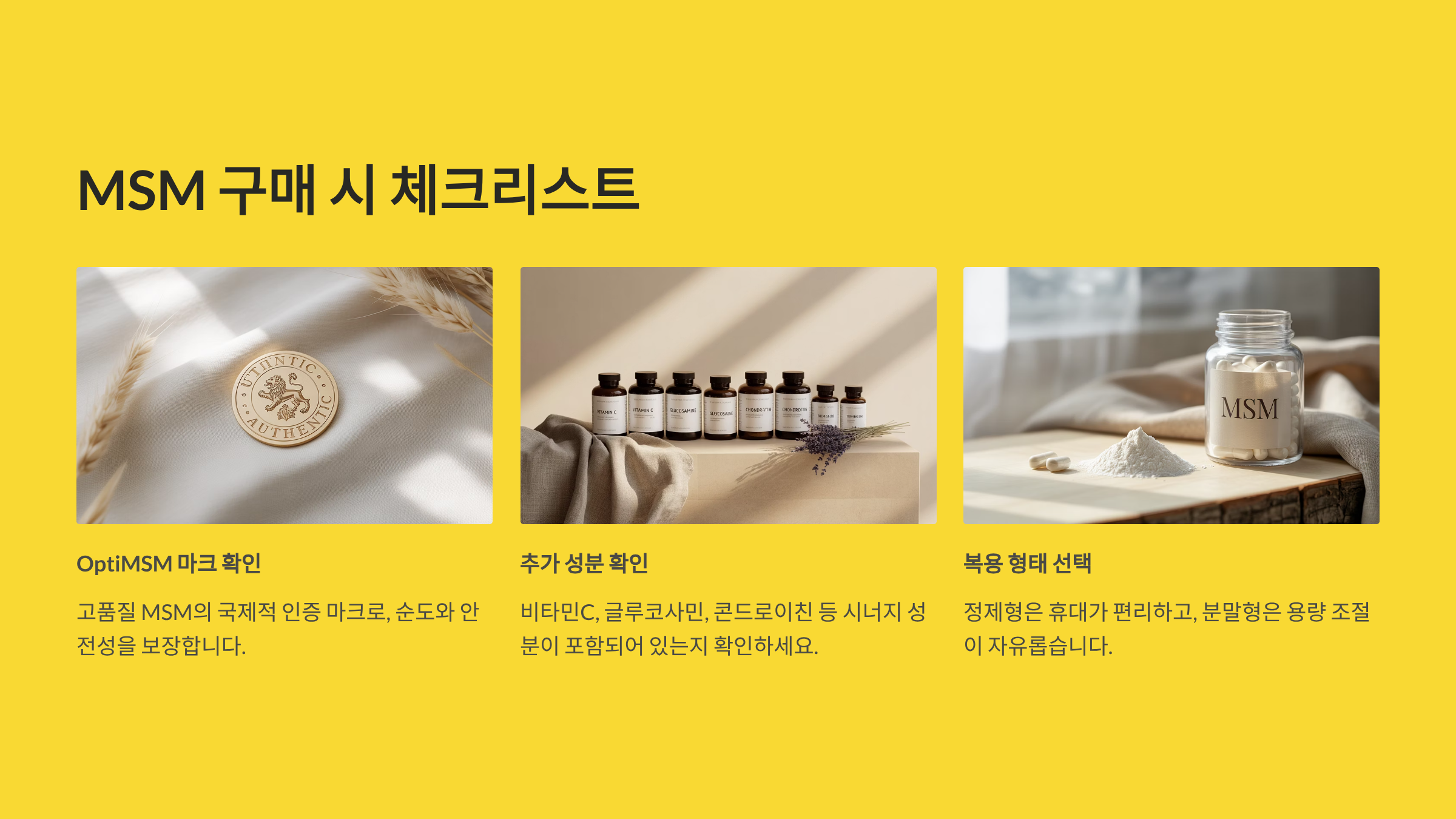 - 비타민C와 동시 섭취: MSM 산화 방지 및 세포 재생에 도움