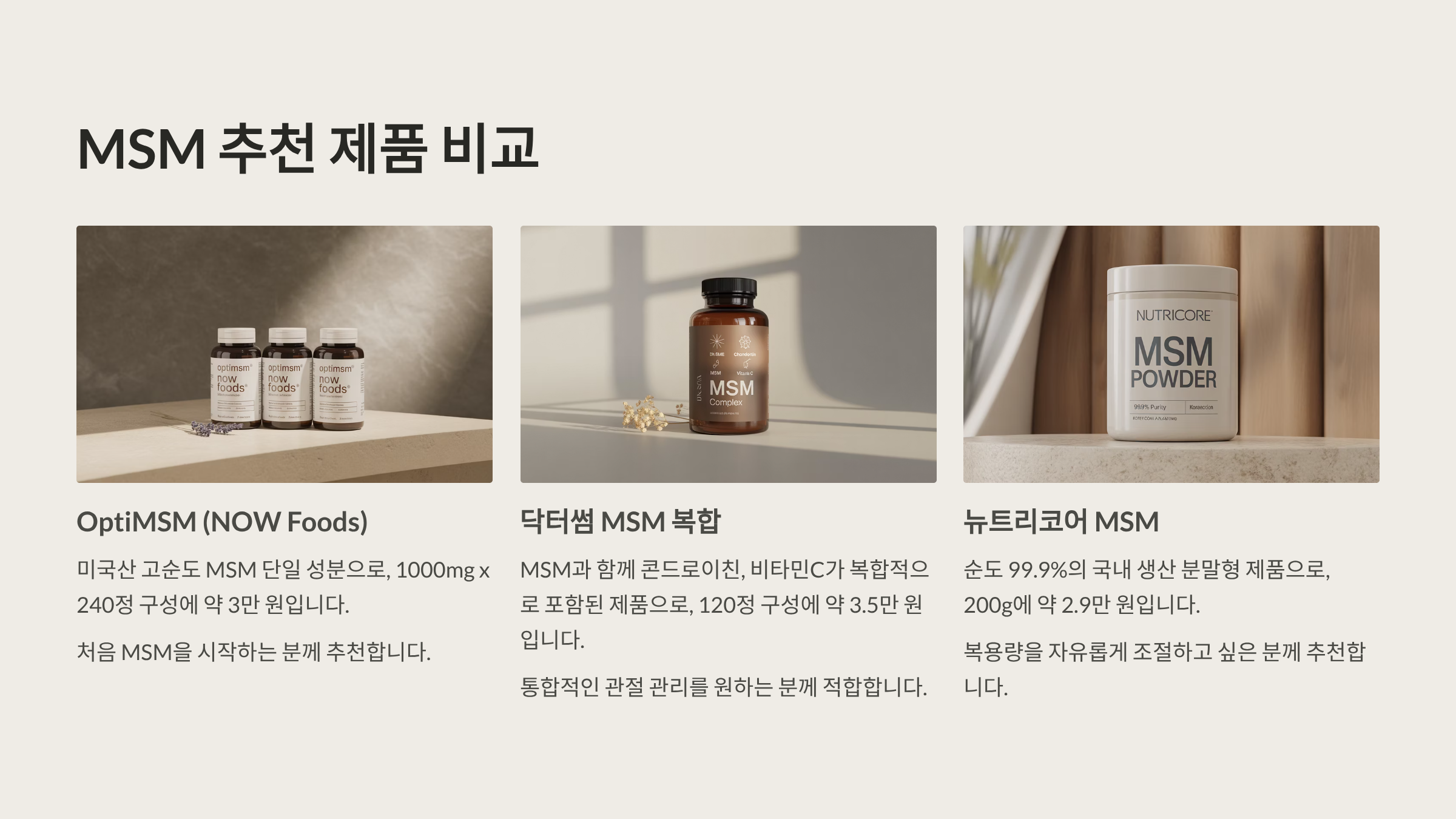 | OptiMSM (NOW Foods) | 미국산 고순도 MSM 단일 성분 | 1000mg x 240정 / 약 3만 원 | 처음 MSM을 시작하는 분 |